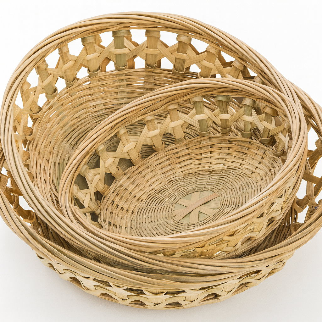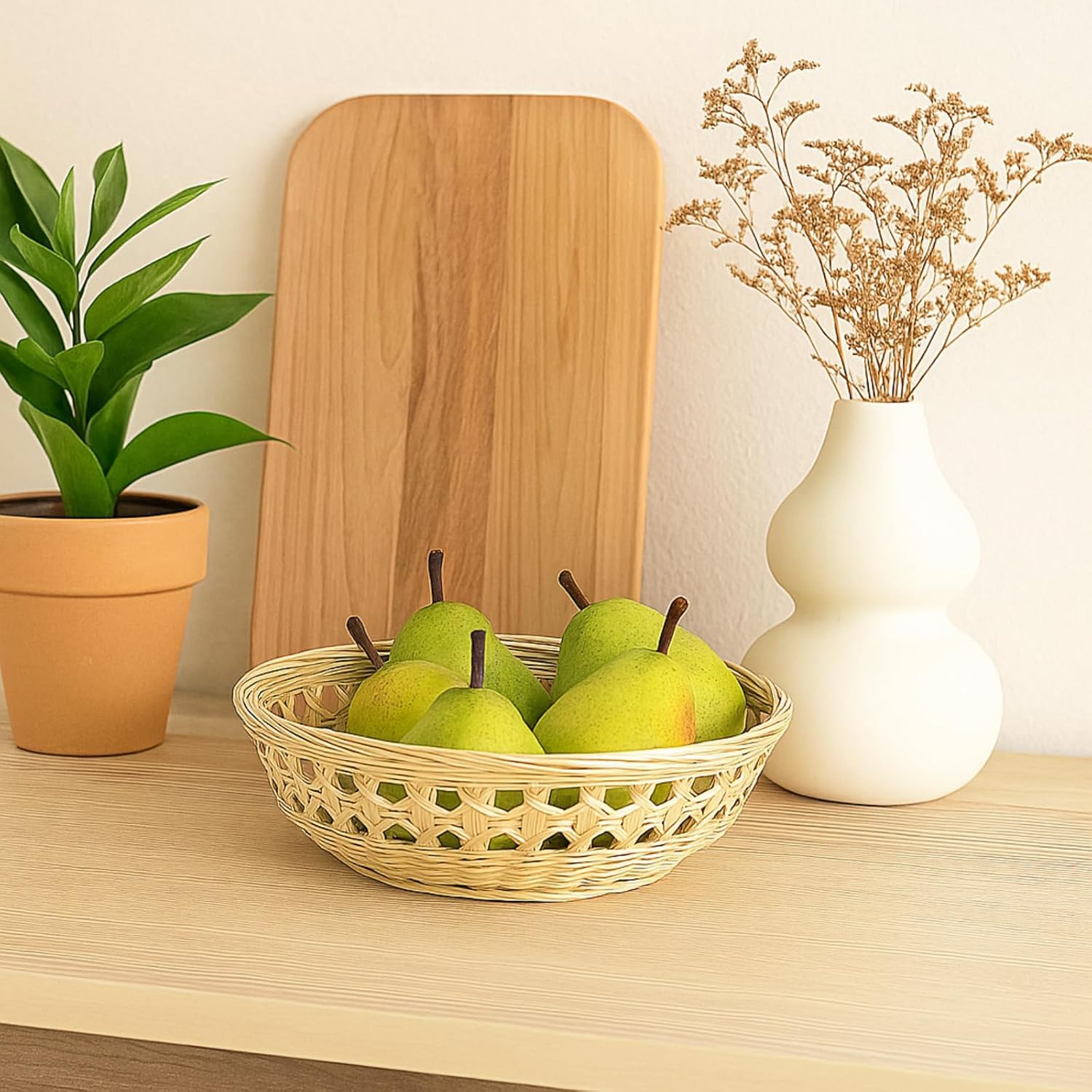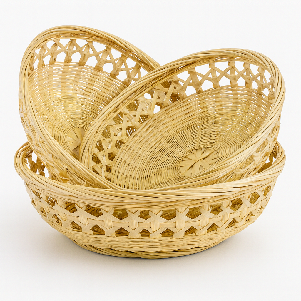 Dieses Set aus drei handgeflochtenen Bambus-Servierkörben bringt natürliche Schönheit und praktische Funktion in Ihr Zuhause. Gefertigt aus nachhaltigem Bambus, eignen sich die Körbe ideal zum Servieren oder Aufbewahren von Brot, Obst, Snacks und Gebäck.